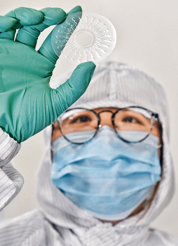 由国内几家科研机构联合攻关开发的包括新冠病毒在内的呼吸道病毒(6种)核酸检测试剂盒(恒温扩增芯片法),只需采集患者的鼻、咽拭子等分泌物样本,在1.5小时内便可一次性检测包括新冠病毒在内的6种呼吸道病毒。图为科技人员在展示恒温扩增芯片。 新华社记者 刘坤/摄