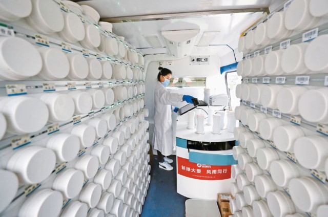 在武汉江夏方舱医院的“流动应急智能中药房”里,工作人员把盛有药方中包含的单味药的药瓶取下来后,逐一扫描确认,准备制药。 新华社记者 沈伯韩/摄